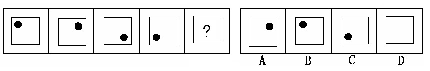 (答案:B。黑點(diǎn)在正方形中順時(shí)針移動。在第5個(gè)圖形中,應(yīng)該正好移動到左上角。)